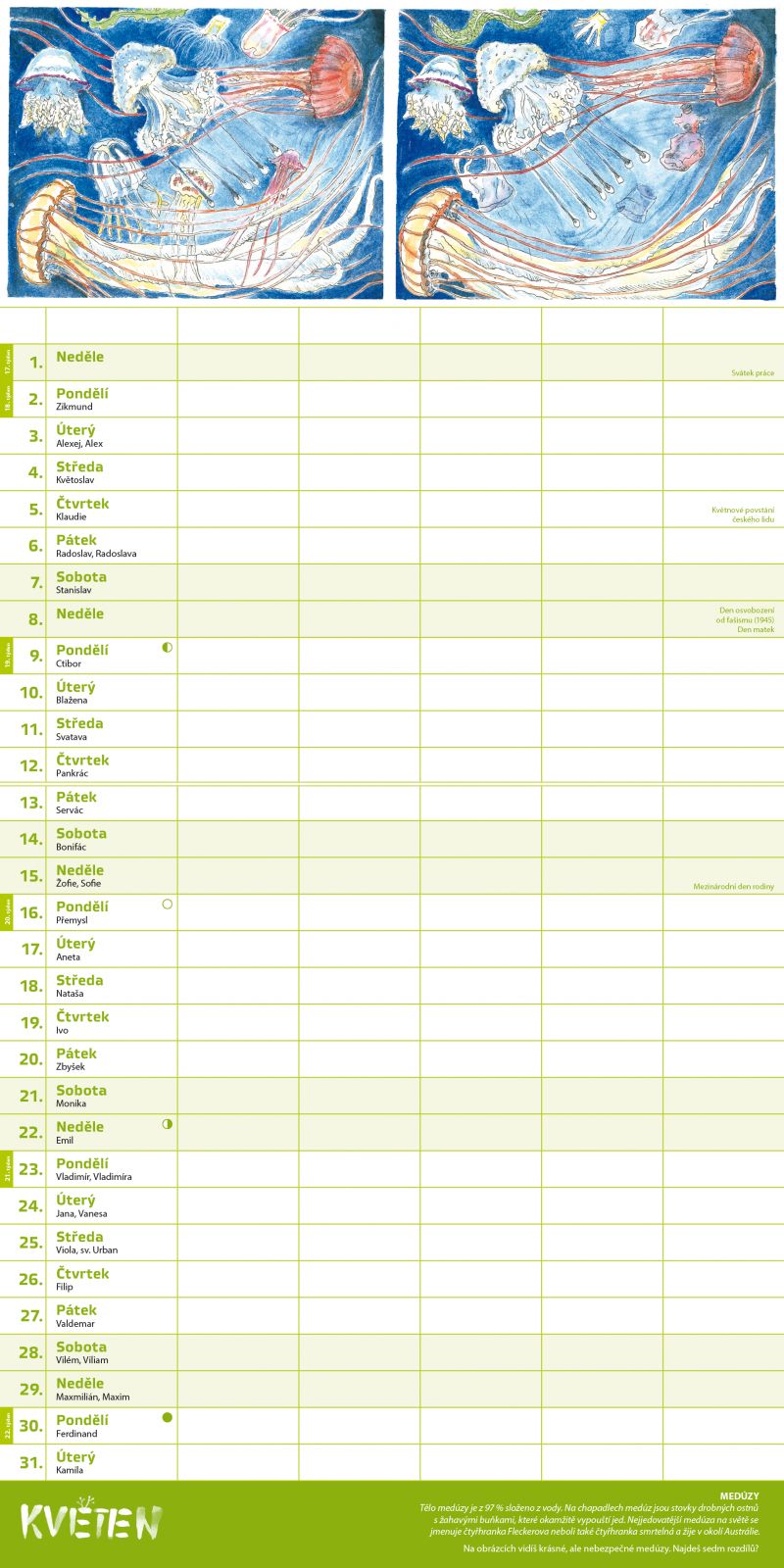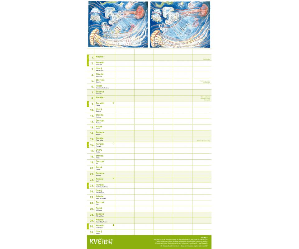Pomoc při organizování a plánování rodinných aktivit vám usnadní „Velký rodinný kalendář 2022“ s podtitulem Mořský život. Kalendář má velký formát a můžete do něj přehledně zapisovat činnosti a plány až pro pět členů rodiny. Na každý měsíc je pro vás připraven obrázek z mořského světa. Ke každému obrázku se vždy váže zábavná hra, jejíž řešení je na konci kalendáře. Najdete zde i zajímavé informace o obyvatelích moří a oceánů. Kalendář obsahuje originální a hravé ilustrace české výtvarnice Markéty Speranza. Organizujte a plánujte čas své rodiny a objevujte tajemství velryb, žraloků a živočichů žijících v hlubinách oceánů, poznávejte život medůz, želv či rejnoků a dalších mořských tvorů.