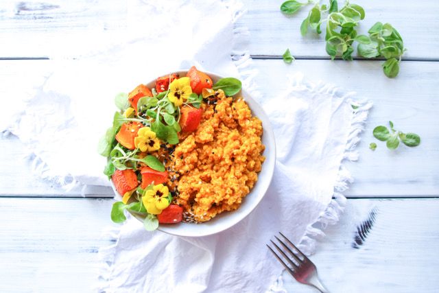 - Dýni s kokosovým mlékem, římským kmínem a trochou chilli rozmixujte najemno. Pyré smíchejte s bulgurem a quinoou.