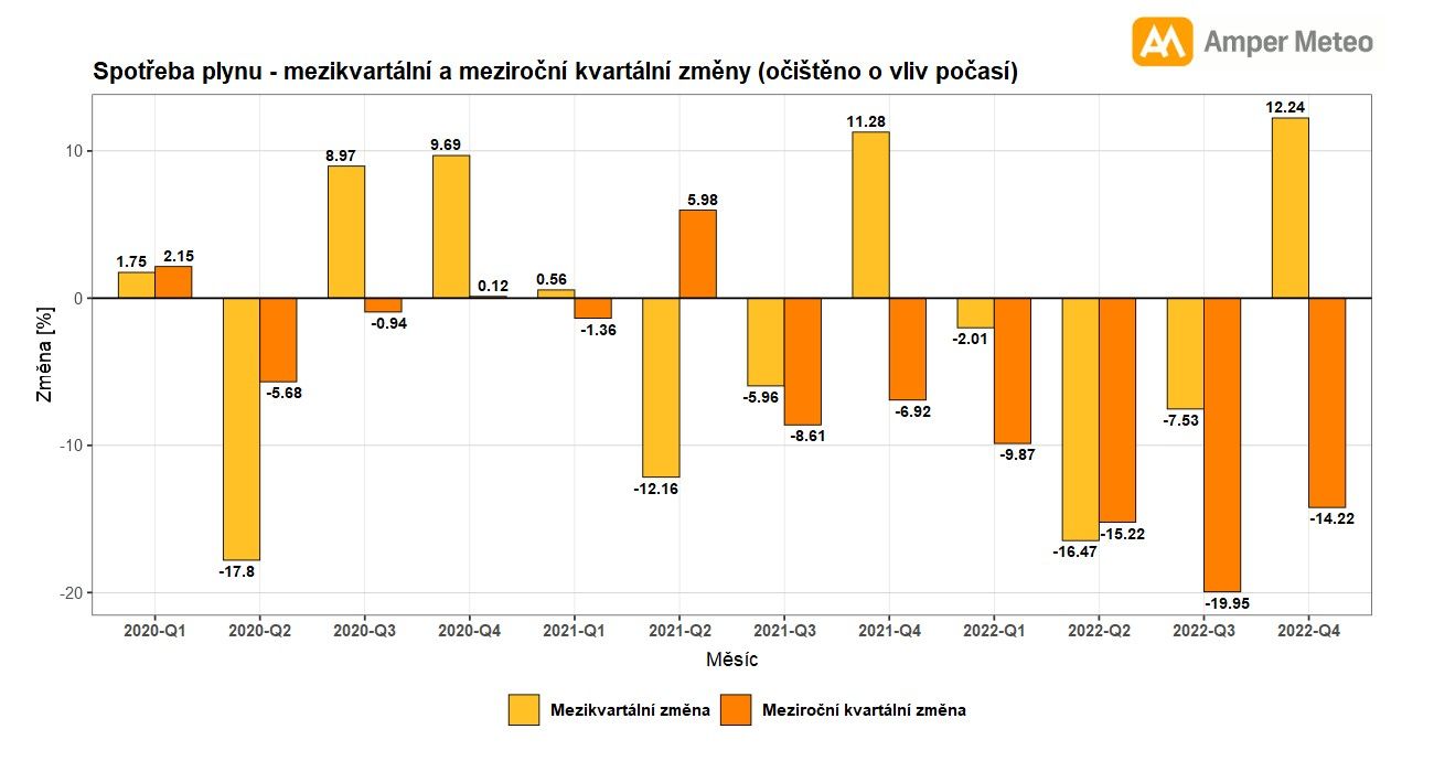 „K úsporám v posledním kvartále také pomohly teploty vzduchu, které byly meziročně vyšší. Říjen byl teplejší o 3 °C a listopad o 0,8 °C. Prosinec vyšel sice teplotně normální a dokonce srovnatelný s tím v roce 2021, ale nejdříve přišla chladná epizoda počátkem prosince, kdy se spotřeba plynu dostala až k 450 GWh/den. Začal panovat strach, jestli nám zásoby plynu vydrží. Naštěstí přišlo výrazné oteplení na Vánoce a spotřeba plynu výrazně klesla a bylo možné naopak i plnit zásobníky. Na Štědrý den byla dokonce spotřeba plynu nižší o 22 % než byl průměr posledních pěti Štědrých dnů.“ uvádí Kamil Rajdl, analytik společnosti Amper Meteo.