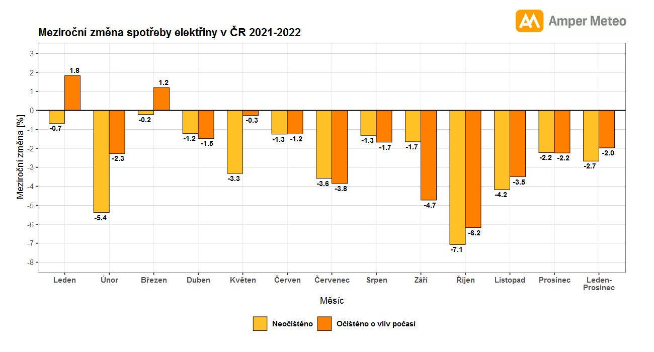 Za celý uplynulý rok jsme spotřebovali meziročně o 2,7 % méně elektrické energie. Po očištění o vliv počasí pak činí celkové úspory pouze 2,0 %. K největším úsporám došlo v září a říjnu, a to jak díky výrobě elektřiny ze střešních FVE, tak i oddálenému začátku topné sezony.