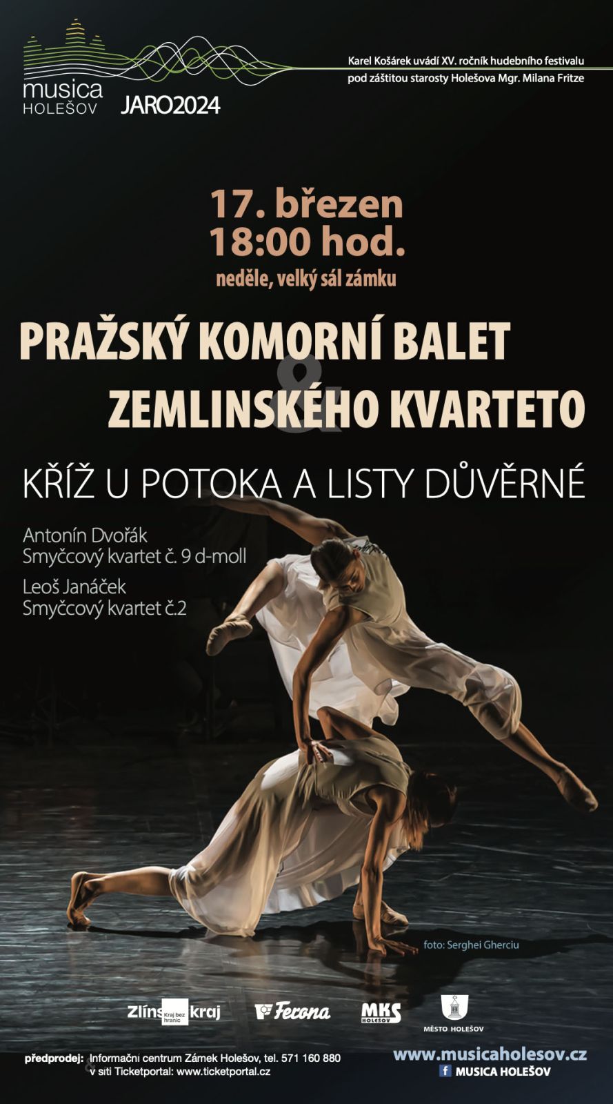 Program nazvaný Kříž u potoka a Listy důvěrné, ve kterém bude účinkovat Pražský komorní balet a Zemlinského kvarteto, proběhne v neděli 17. března od 18 hodin ve velké sále holešovského zámku. Říká se, že tanec je zhmotněním hudby. Že je to pravda dokazuje Pražský komorní balet ve svých baletně hudebních projektech již mnoho let. Nádherným a ukázkovým příkladem jsou dvě mistrovské choreografie Aleny Peškové a Petra Zusky - Kříž u potoka a Listy důvěrné s hudbou Antonína Dvořáka a Leoše Janáčka. Síla prožitku pohybového vyjádření hudby je ještě umocněna přímým účinkováním smyčcového kvarteta, v tomto případě jedním z našich nejlepších souborů, a to Zemlinského kvarteta. Mimochodem, právě Pražský komorní balet nadchnul publikum v Holešově před lety svým večerem Carmina Vetera.
