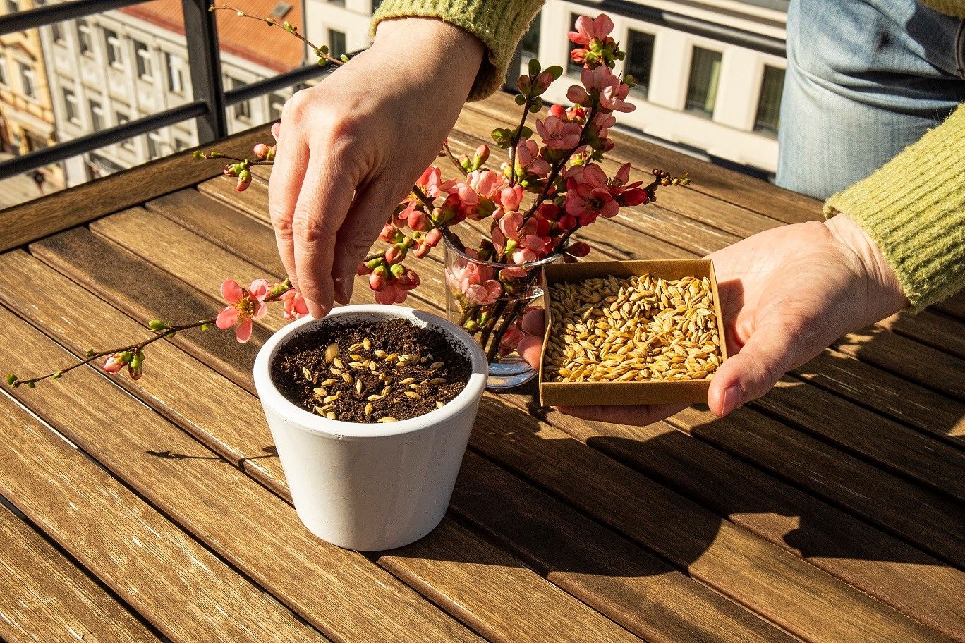 - Do květináče s hlínou rovnoměrně nasypejte osení a pravidelně zalévejte. Po týdnu vyroste do výšky cca 10 cm.