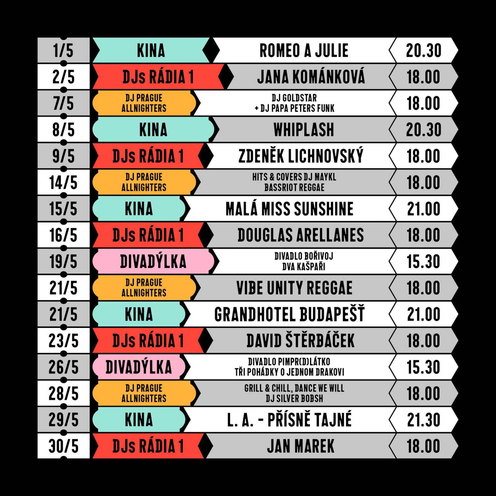 Od května bude v zóně s pouličním jídlem pěkně rušno. Vyrazte do venkovního kina, každé úterý na DJs RUDE BOYS, každý čtvrtek na DJs Radia 1 nebo nedělní divadýlka pro děti. To vše s poctivým street foodem v ruce a osvěžujícími drinky.