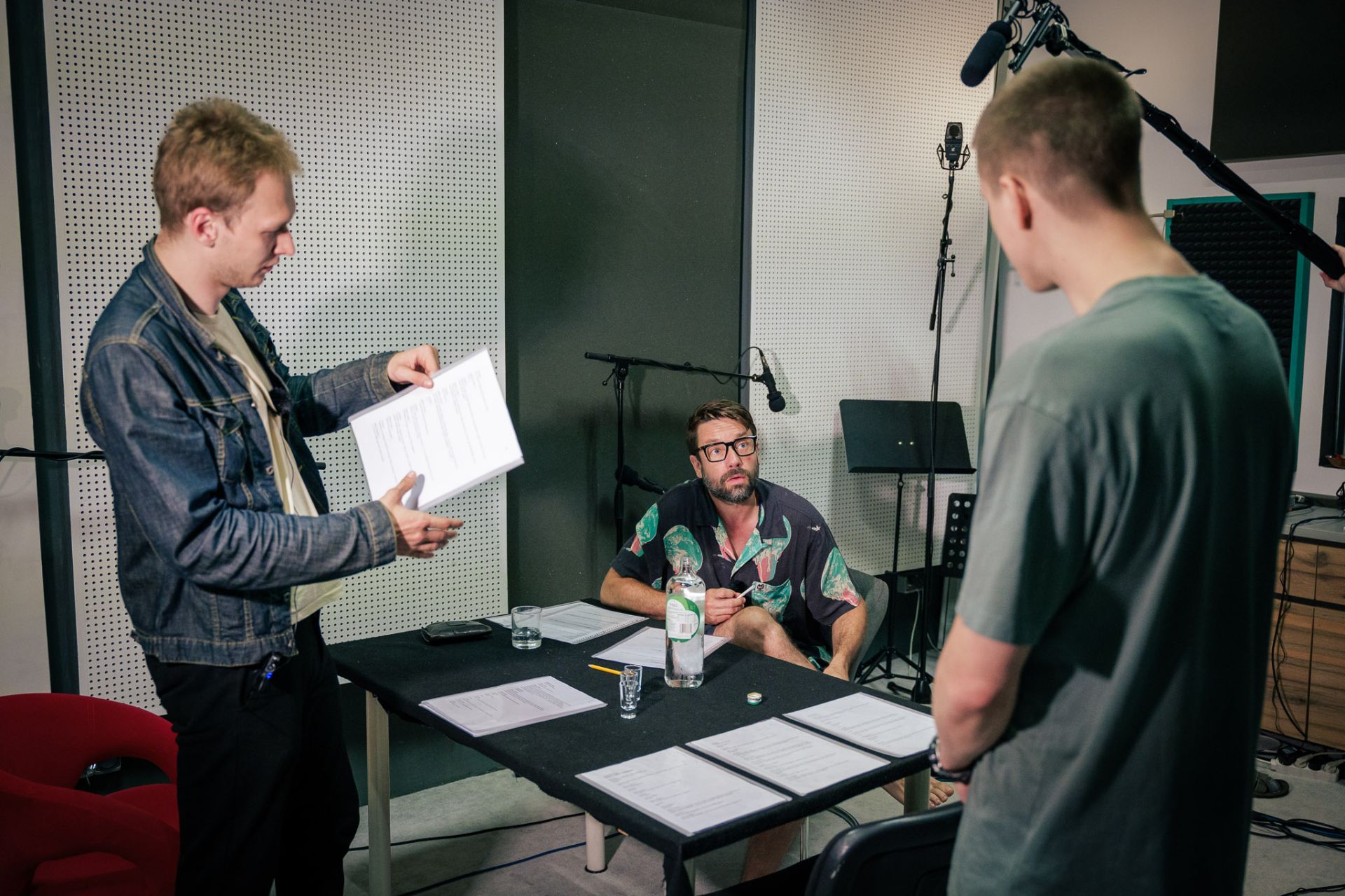 Studio, ve kterém se natáčelo, bylo aranžované tak, že evokovalo konspirační byty a domovy hlavních postav, v nichž se odehrává celý děj. „Bylo vybaveno stolky, křesly, gauči a dalšími rekvizitami, které herci v průběhu natáčení používali. Šlo například o skleničky, jídlo či doutníky. Herci nestáli za pultíky, ale byli neustále v pohybu. Nabírání zvuku tak připomínalo spíše filmové postupy,“ přibližuje režisérka Bela Schenková.