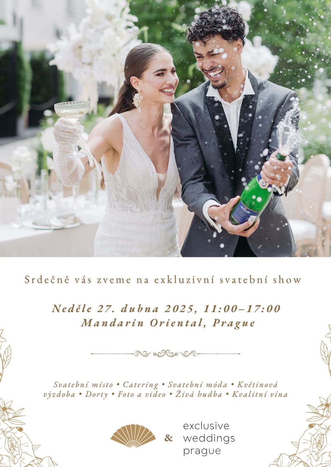 Elegantní, butiková svatební show v hotelu Mandarin Oriental, Prague ve spolupráci s agenturou Exclusive Weddings in Prague nabídne den plný inspirace a setkání s pečlivě vybranými profesionály z oboru, kteří vám představí své služby a poradí. Těšit se můžete na delikatesy od šéfkuchaře, přehlídku svatebních šatů od světových návrhářů, květinová aranžmá z rukou talentovaných floristů, designové šperky, výběr luxusního křišťálu, degustaci vín, prezentaci vizážistky, fotografů, designerů a mnoho dalšího. Příjemnou atmosféru doplní živá hudba a DJ. Vstup na akci je zdarma.