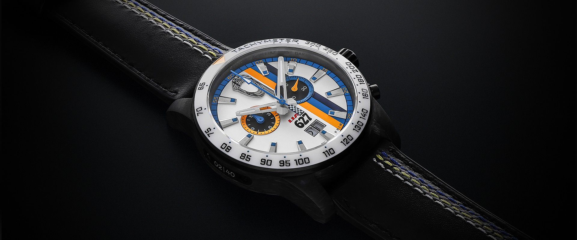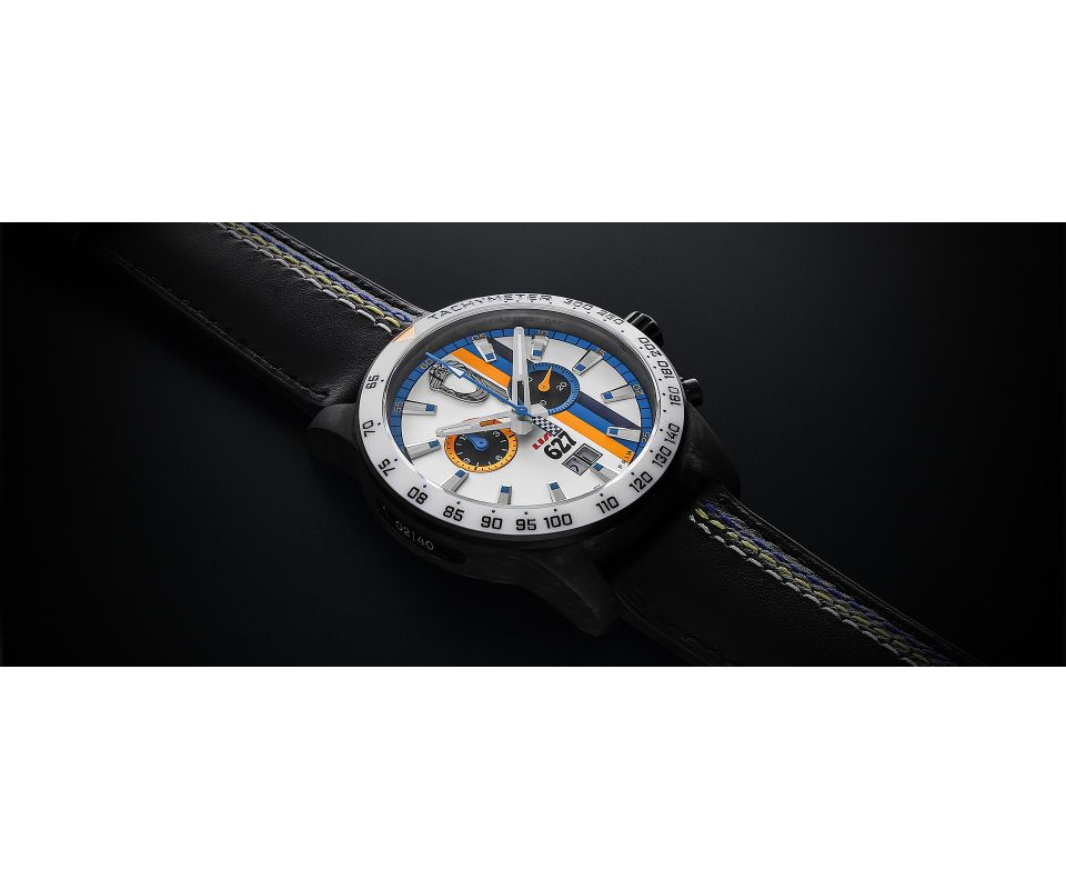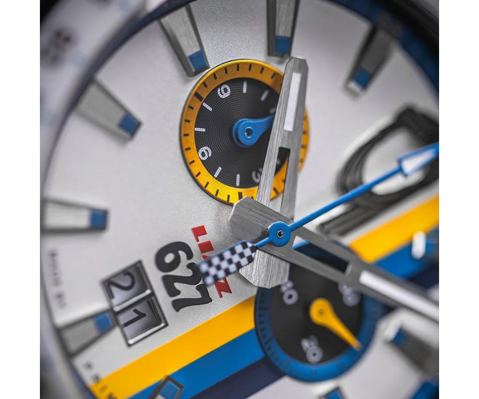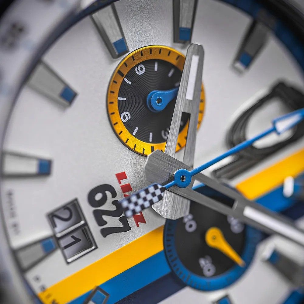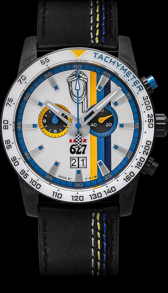 Číselník hodinek odkazuje na ikonické barvy závodního vozu. Bílá, žlutá a modrá jsou doplněné původním logem a číslem 627. Design vznikal více než tři měsíce ve spolupráci s rally jezdcem Josefem Kakrdou a členy původní posádky, jejichž podpisy zdobí dárkové balení.