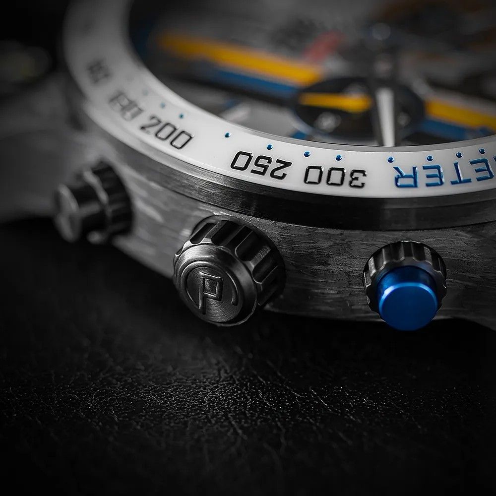 Uvnitř hodinek tiká švýcarský chronograf, který zaručuje vysokou přesnost i v extrémních podmínkách. Vodotěsnost 10 ATM, šroubovací korunka a sportovní linie podtrhují technický charakter modelu.