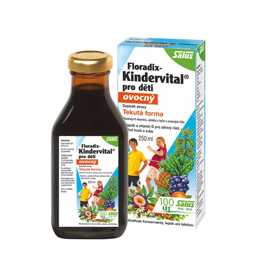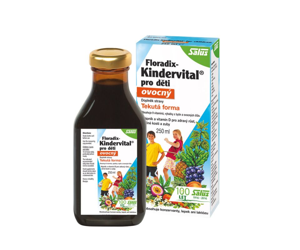 Dětský kolektiv je spolu s měnícím se počasím a klesajícími teplotami velkpou výzvou. Jejich organismus podpoří tekutý doplněk stravy Salus Floradix Kindervital, který je zdrojem devíti základních vitamínů od A po E. Obsahuje také vápník, potřebný pro udržení normálního stavu kostí i zubů a správnou činnost svalů. Nechybí ani bylinné výtažky – konkrétně z kořene karotky, plodu anýzu a koriandru, nati potočnice lékařské a kopřivy, listu špenátu či květu heřmánku. Pro děti je pochopitelně důležitá i příjemná chuť. K ní přispívají koncentráty ovocných džusů, například z hroznového vína, jablka, ananasu a meruněk. Salus Floradix Kindervital je vhodný pro děti od tří let.