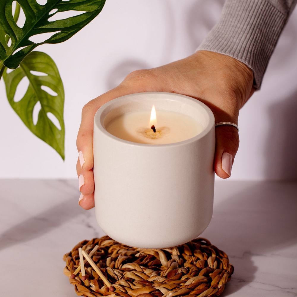 Útulnou atmosféru vytvoří sójová svíčka v ručně odlévané nádobě z jesmonitu. Až svíčka dohoří, kelímek vám zůstane jako stylový obal na květináč nebo stojánek na tužky – udržitelný design v praxi.