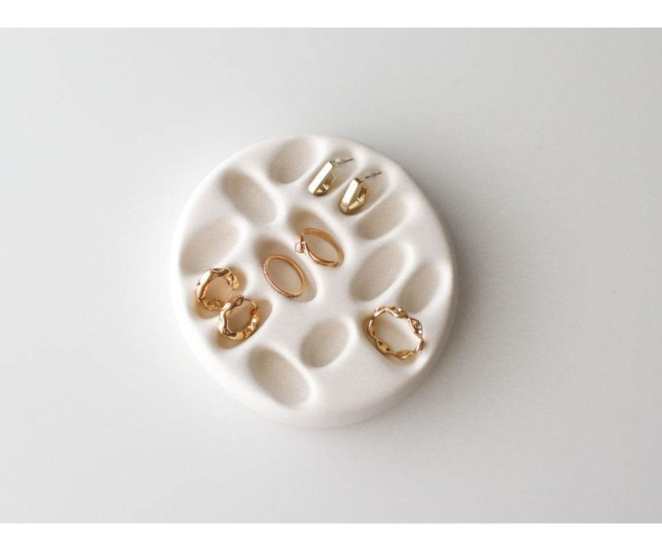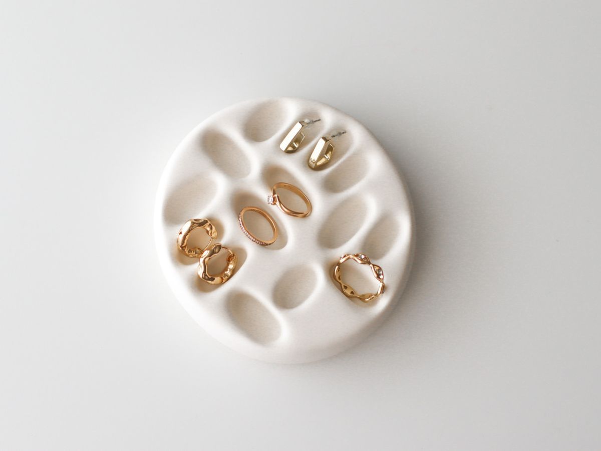 Značka Anya Design vytvořila šperkový tácek „Gold coaster“ s organickým tvarem a jemnými prohlubněmi, který připomíná přírodní oblázky. Vaše prstýnky, náušnice nebo talismany v něm najdou bezpečné a stylové útočiště.
