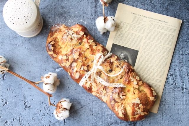 Poté těsto rozdělte na 4 díly, utvořte z nich dlouhé válečky a zapleťte. Postup si můžete přesně zobrazit v našem videoreceptu. Potřete vyšlehaným vejcem a zasypte plátky mandlí. Nechte na plechu vyloženém pečicím papírem ještě 25 minut kynout. Poté pečte v předehřáté troubě při 180 °C nejprve 10 minut, poté snižte teplotu na 160 °C a pečte dozlatova, dohromady asi 30 minut. Kontrolujte špejlí.
