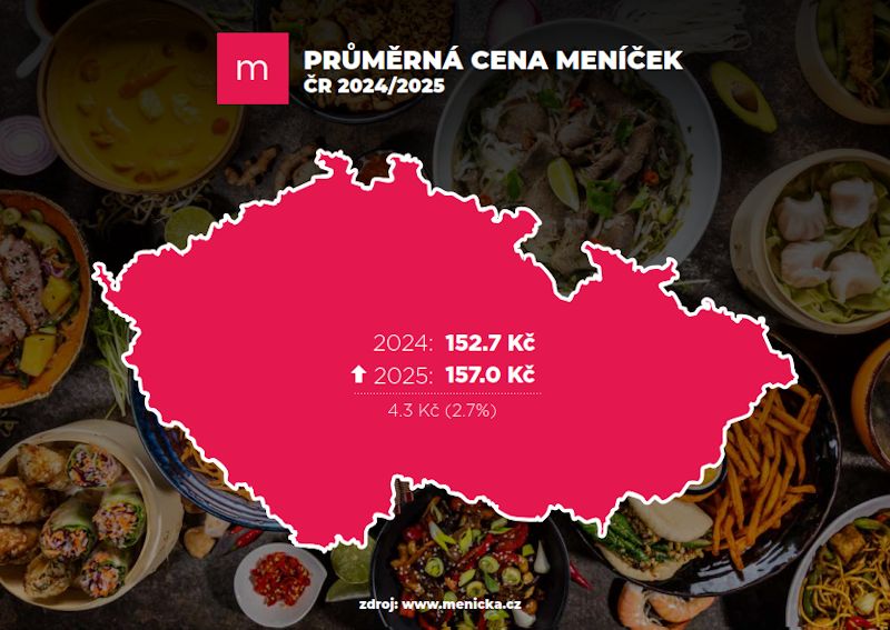 Průměrná cena poledního meníčka rostla i v letošním roce. Meziroční srovnání 2024/2025 vykazuje změnu ve výši 4,3 kč, což odpovídá (+2,7 %). Tak vyplývá z analýzy obědového serveru menicka.cz. Ten ve svém každoročním bilancování zohlednil svou databázi - téměř 6000 gastronomických provozoven napříč Českou republikou.