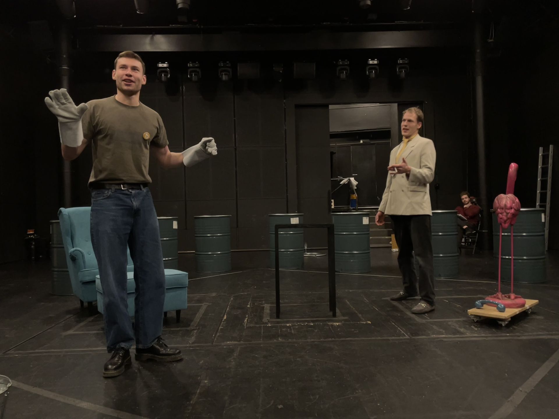 Docentka Eva Salzmannová má jako dlouholetá pedagožka na starost hereckou spolupráci a inspirovaná tím, co děje na současné politické scéně, vede herce ke grotesknímu výrazu. K tomu, co již bylo řečeno, lakonicky dodává: „V závěru hry je řečeno samotnými žháři: Neptejte se, kdo podpálil město. Neptejte se, kdo jsou žháři. Zeptejte se, kdo nám otevřel dveře.“