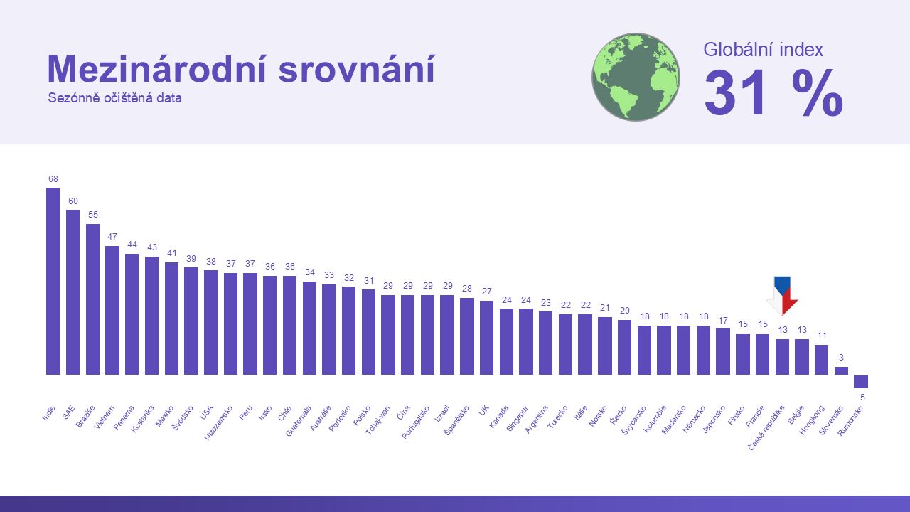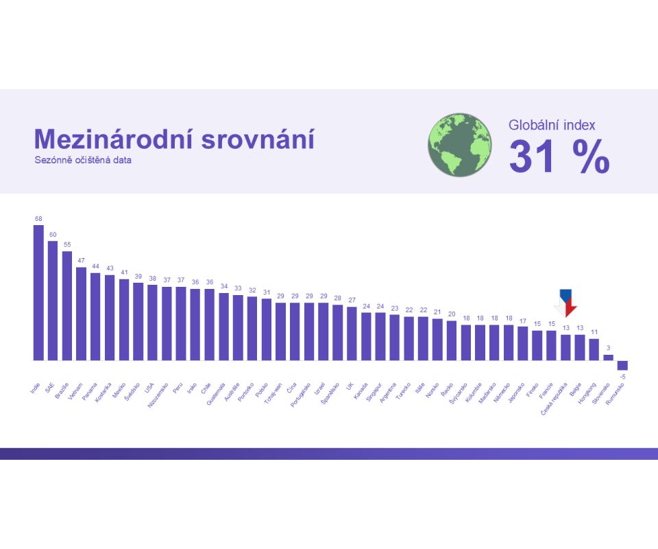 Evropa (21) sice čtvrté čtvrtletí po sobě mírně roste, ale nadále zaostává za ostatními regiony. Růst táhne zejména jižní Evropa, zatímco Německo, střední a východní Evropa zůstávají pod průměrem. Německo (18), jako klíčový odběratel českého exportu, zůstává nadále na vyšší úrovni optimismu než Česko, ale v předchozích letech býval jejich Index i o polovinu vyšší, než je nyní. Německo zaostává za globálním průměrem o 13 bodů. Přestože ekonomika vykazuje známky stabilizace díky vyšším vládním výdajům a lepším očekáváním růstu HDP, přetrvávající geopolitické a obchodní nejistoty vedou firmy k opatrnosti.