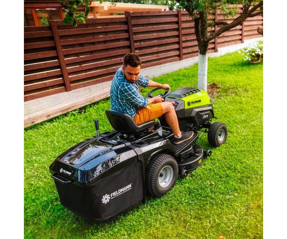 Nejvýkonnějším modelem v nabídce je traktor Fieldmann FZTR 9840-B. Ten je určený hlavně pro větší pozemky, kde oceníte silnější motor o objemu 452 cm³ s výkonem 9,2 kW i širší 98cm záběr sečení. Díky tomu zvládne práci rychleji a bez zbytečného přejíždění. Nechybí hydrostatická převodovka pro plynulou jízdu, centrální nastavení výšky sečení v rozsahu 30–90 mm, elektrické startování nebo objemný sběrný koš o kapacitě 250 litrů, takže se nemusíte každou chvíli zastavovat.
